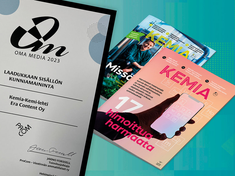 Kemia-Kemi-lehti sai viime viikolla kunniamaininnan laadukkaasta sisällöstään. Oma media -arvion järjestää ProCom – Viestinnän ammattilaiset ry. Vuoden 2023 arviossa oli mukana 29 kovatasoista organisaatiomediaa.